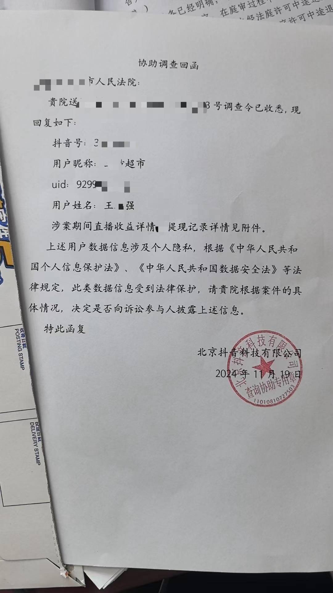 北京抖音科技有限公司出具的协助调查回函